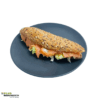 Wit meergranenbroodje met ovengebakken kipfilet omhuld met kalkoenhuid, ijsbergsla en barbecuesaus.