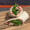 Tarwetortilla met gerookte zalmfilet, zuivelspread met bieslook, rucola en kappertjes.